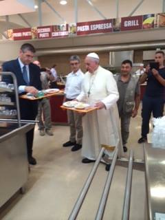 Ở Nhà Thánh Marta, Äức Phanxicô ăn ở phòng ăn chung, bà n bên trái cá»a ra và o. Các giám mục và khách có thể Ä‘i qua ngà i, ngà i bưng đĩa thức ăn vitello tonnato hay khoai nướng lò, chỠđến lượt mình hâm ở lò vi sóng, hoặc và o tối chúa nháºt thì ăn đồ ăn nguá»™i. Nếu gặp may, khách vãng lai có thể gặp ngà i ở thang máy. Ngà i sẽ trao đổi và i câu nói đùa. Vá»›i khách lạ sững sá» khi thấy giáo hoà ng trong thang máy, ngà i nói: “Äừng sợ, tôi không cắn đâu.†Câu ngà i thÃch nói: “Bạn có biết sá»± khác biệt giữa chế độ độc tà i và nghi thức không? Chế độ độc tà i thì bị láºt đổ.â€Â