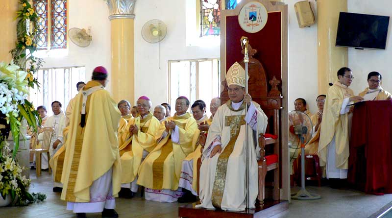 Äoà n rước đồng tế khởi hà nh từ toà Giám mục lúc 9 giá» 45, tiến vá» nhà thá» ChÃnh Toà . Bước qua cá»a chÃnh nhà thá» ChÃnh Toà , Äức tân giám mục giáo pháºn đã được đức Tổng Giám mục Trưởng Giáo tỉnh Huế Ph.X. Lê Văn Hồng giá»›i thiệu vá»›i vị đại diện há»™i đồng tư vấn giáo pháºn. Sau đó, tại cung thánh nhà thá», nghi thức nháºm chức giám mục giáo pháºn bắt đầu được tiến hà nh vá»›i việc trình và đá»c giấy chứng thá»±c sắc lệnh bổ nhiệm do Äức TGM đại diện Toà Thánh Leopoldo Girelli ấn ký (thay cho sắc chỉ cá»§a ÄGH Phanxicô). Tiếp đến, ngay tại cung thánh, trước mặt Äức TGM Äại diện Toà Thánh và 2 ÄGM phụ lá»… (Äức cha Matthêu Nguyá»…n văn Khôi và Äức Cha Anphong Nguyá»…n Hữu Long), Äức cha Giuse Äặng Äức Ngân, giám mục tân nhiệm giáo pháºn Äà Nẵng tuyên xưng đức tin và đặt tay tuyên thệ trung thà nh. Sau khi Äức Giám mục tân nhiệm giáo pháºn Äà Nẵng và các vị giám mục, linh mục liên quan kết thúc việc ký nháºn các văn bản luáºt định ; nghi thức nháºm chức được tiếp tục vá»›i việc giám mục tân nhiệm nháºn ngai toà nÆ¡i có treo huy hiệu và khẩu hiệu giám mục cá»§a ngà i trong nhà thá» chÃnh toà giáo pháºn. Tiếp đến, đức giám mục tân nhiệm nháºn lá»i chúc mừng cá»§a cha Antôn Trần Văn Trưá»ng, đại diện linh mục Ä‘oà n và cá»™ng Ä‘oà n dân Chúa giáo pháºn Äà Nẵng, cùng vá»›i nghi thức tôn phục cá»§a đại diện má»i thà nh phần dân Chúa trong toà n giáo pháºn