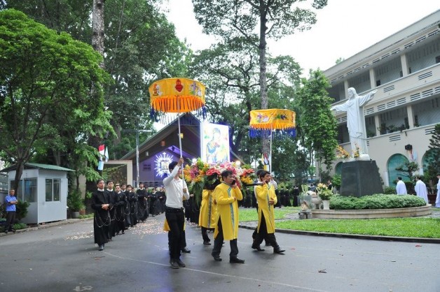 17 g 30, khởi kiệu lên đưá»ng vá»›i Thánh Giá nến cao, đại diện các Ä‘oà n thể, quý thầy, các em tung hoa, kiệu Äức Mẹ, quý Cha đồng tế và cuối cùng là Äức Cha Emmanuel chá»§ sá»± Thánh Lá»… chiá»u nay. Äoà n kiệu hôm nay rất dà i bởi đơn giản lòng sùng kÃnh Mẹ được con cái Mẹ diá»…n tả cách rõ nét. Phải chăng đây là dấu chỉ quy tụ con cái cá»§a Mẹ và nhá» lòng quảng bá sùng kÃnh Mẹ cá»§a tu sÄ© Dòng Chúa Cứu Thế trở nên hiện thá»±c.